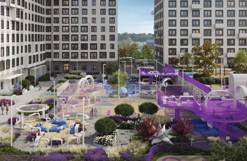 Благоустройства: зона функциональной детской площадки; зона функциональной детской площадки; корт для игры в падел, футбольный корт; площадка для малышей с песочным покрытием; смотровые площадки (скайвэй) с арт-зонами; прогулочные аллеи и зоны отдыха; амфитеатр и арт-объект «Световая спираль»; скамейки и велопарковки.