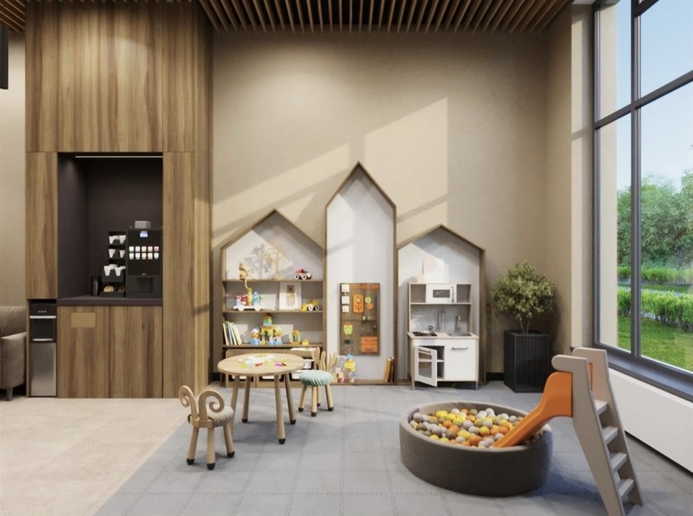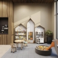 Соседский центр: Уникальное пространство для общения, отдыха и совместного досуга. Это место, где резиденты могут встречаться с друзьями, проводить время с семьей или работать в уютной атмосфере, пространство дополнено проекционным экраном, который превращает зону отдыха в мини-кинотеатр или площадку для презентаций.