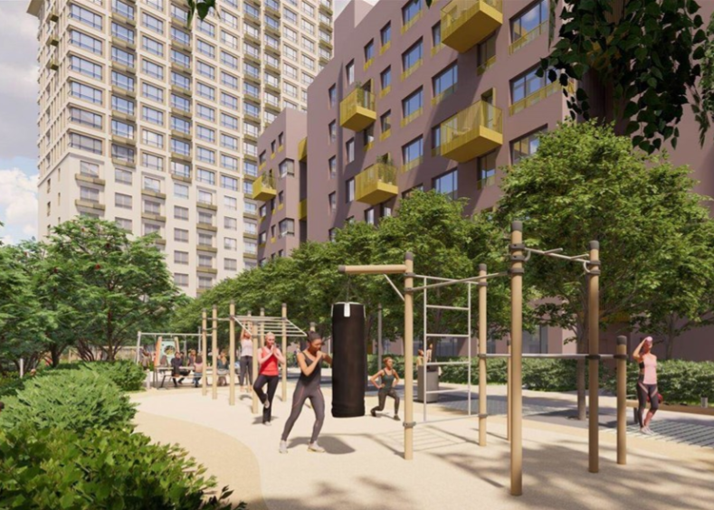 Парадный вход во двор имеет акцентное мощение и озеленение, входная калитка вызывную панель домофона, место для сумок и акцентное освещение. В пространстве для отдыха предусмотрены скамья, урна, велопарковка, акцентное освещение.