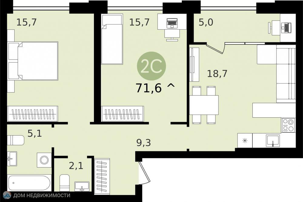 Площадь: Общая: 72 м2  Жилая: 31 м2  Кухня: 19 м2